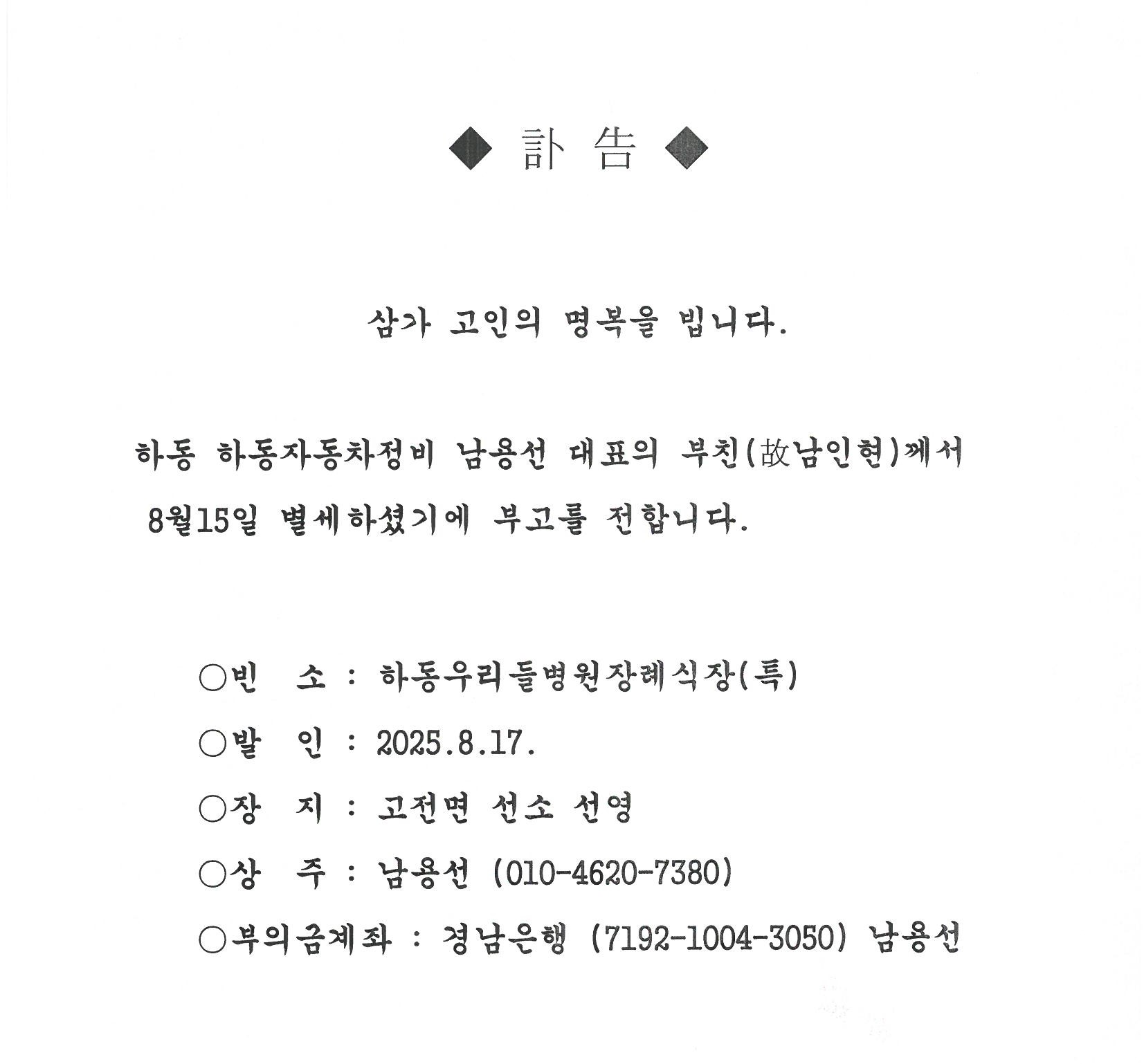 부고[訃告](하동) 하동자동차정비 남용선 대표의 부친 별세 알림