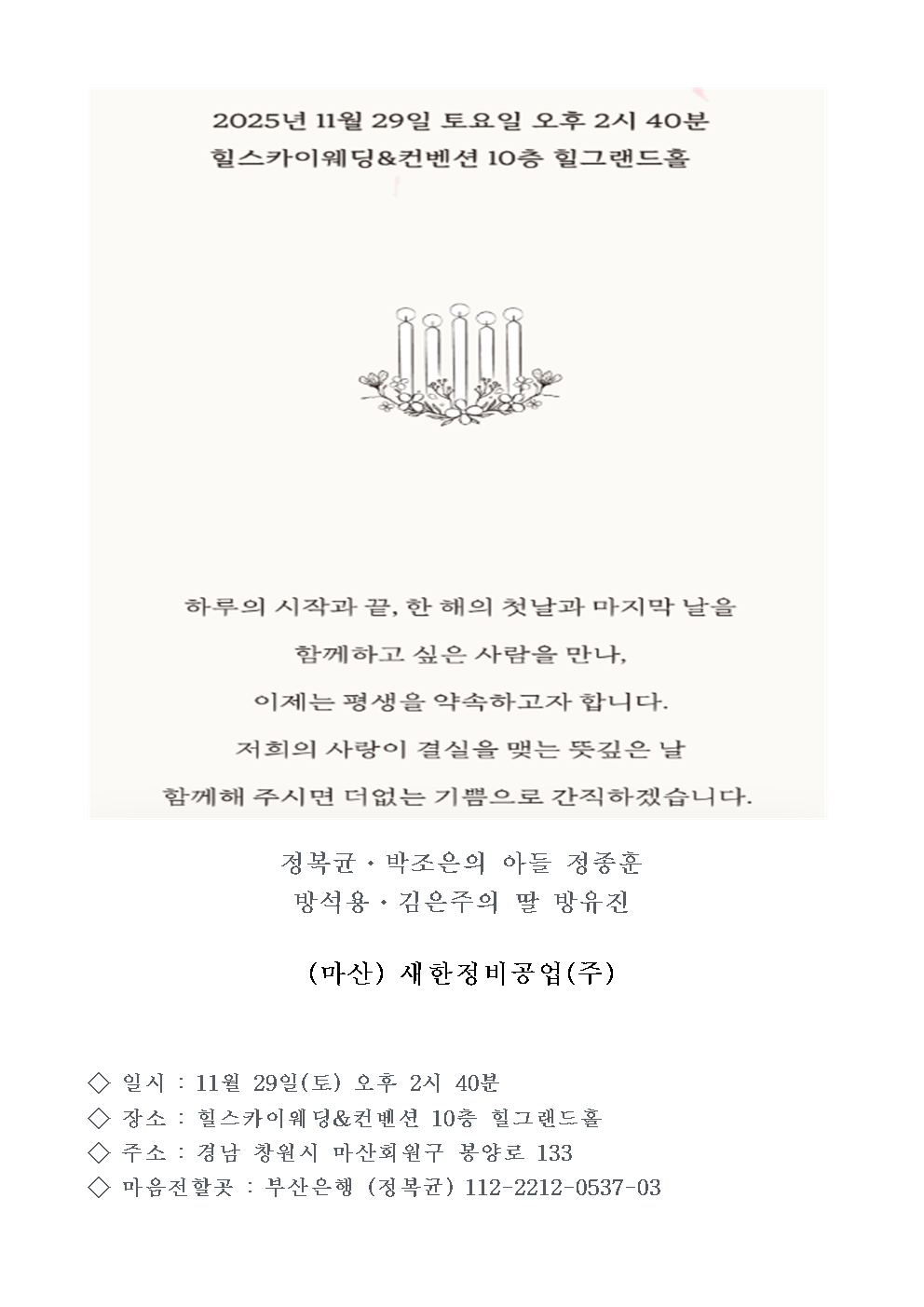 (마산)새한정비공업(주) 정복균 이사의 자녀 결혼 알림